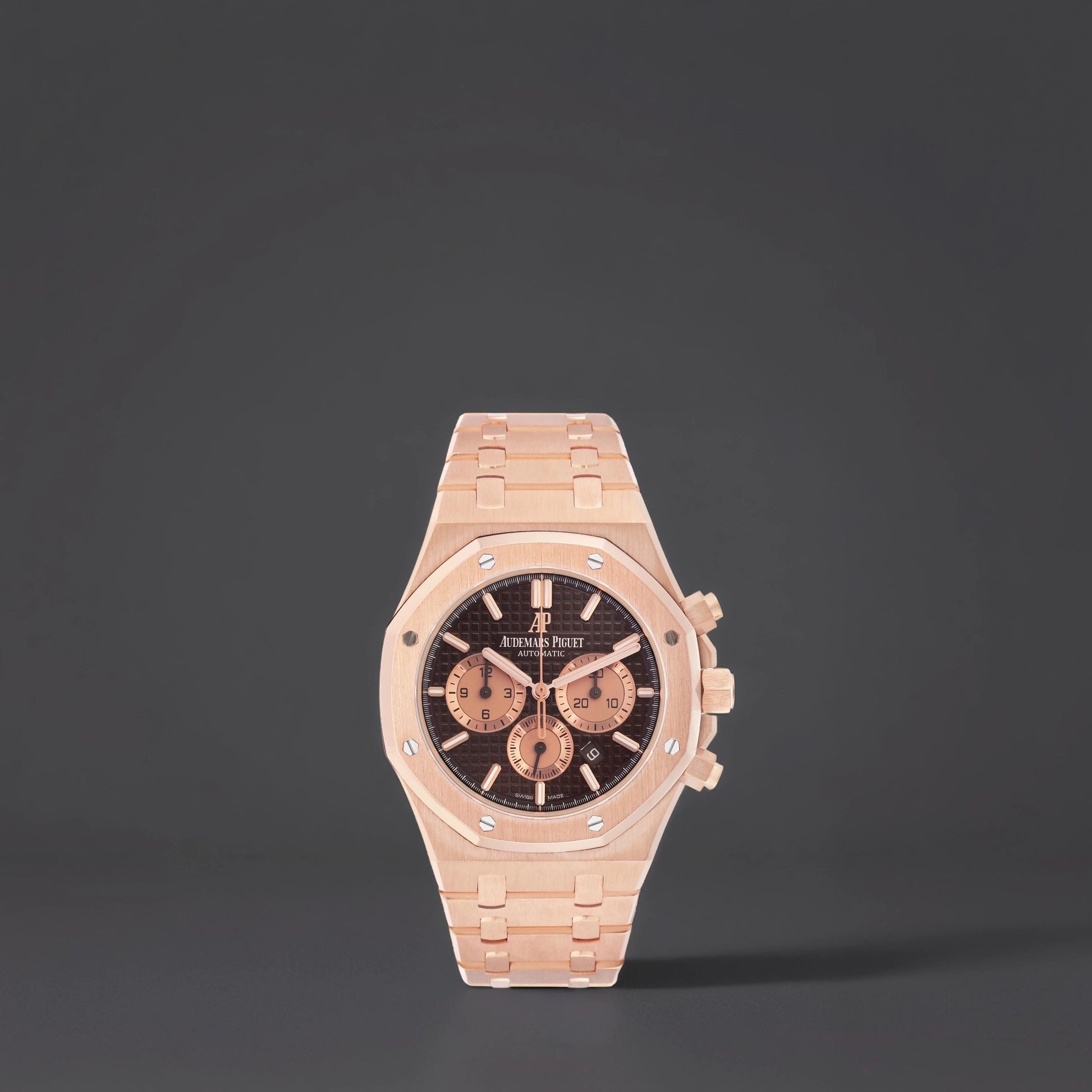 Audemars Piguet Royal Oak Brown Dial Rose Gold Watch. Automatic self-winding chronograph movement. 40-hour power reserve. 18K rose gold octagonal case 41.0 mm in diameter. Two pushers operate the chronograph functions. Pointed crown guards. Audemars Piguet logo on the crown. 18K rose gold octagonal bezel punctuated with 8 signature screws. Scratch resistant glare proofed sapphire crystal. Brown dial with Grande Tapisserie, "waffle patterned" design. Applied rose gold index hour markers and baton hands with luminescent fill. Large rose gold central seconds chronograph hand. Date window located between the 4 and 5 o'clock position. Three Rose gold subdials with concentric circle pattern finish -- running small seconds, 30-minutes, and 12-hour chronograph registers. 18k rose gold bracelet with an AP folding clasp.