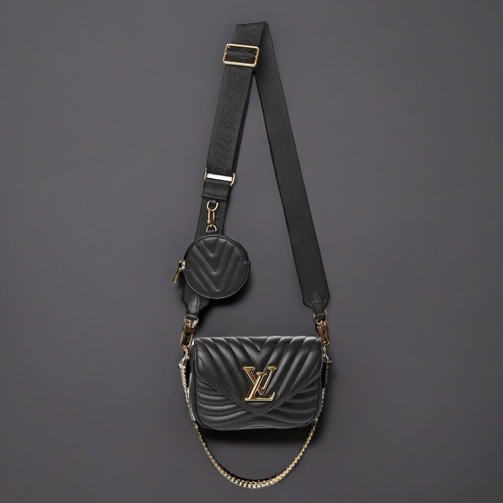 This is an authentic Louis VUITTON Calfskin New Wave Multi Pochette in Black. This chic shoulder bag is crafted of quilted calfskin leather in black. The shoulder bag features a gold chain strap, an adjustable shoulder strap, and edgy hardware with an aged gold metal finish. The top flap opens to a black microfiber interior with a patch pocket. Enjoy this bag for day or evening use with the luxury and style of Louis Vuitton!