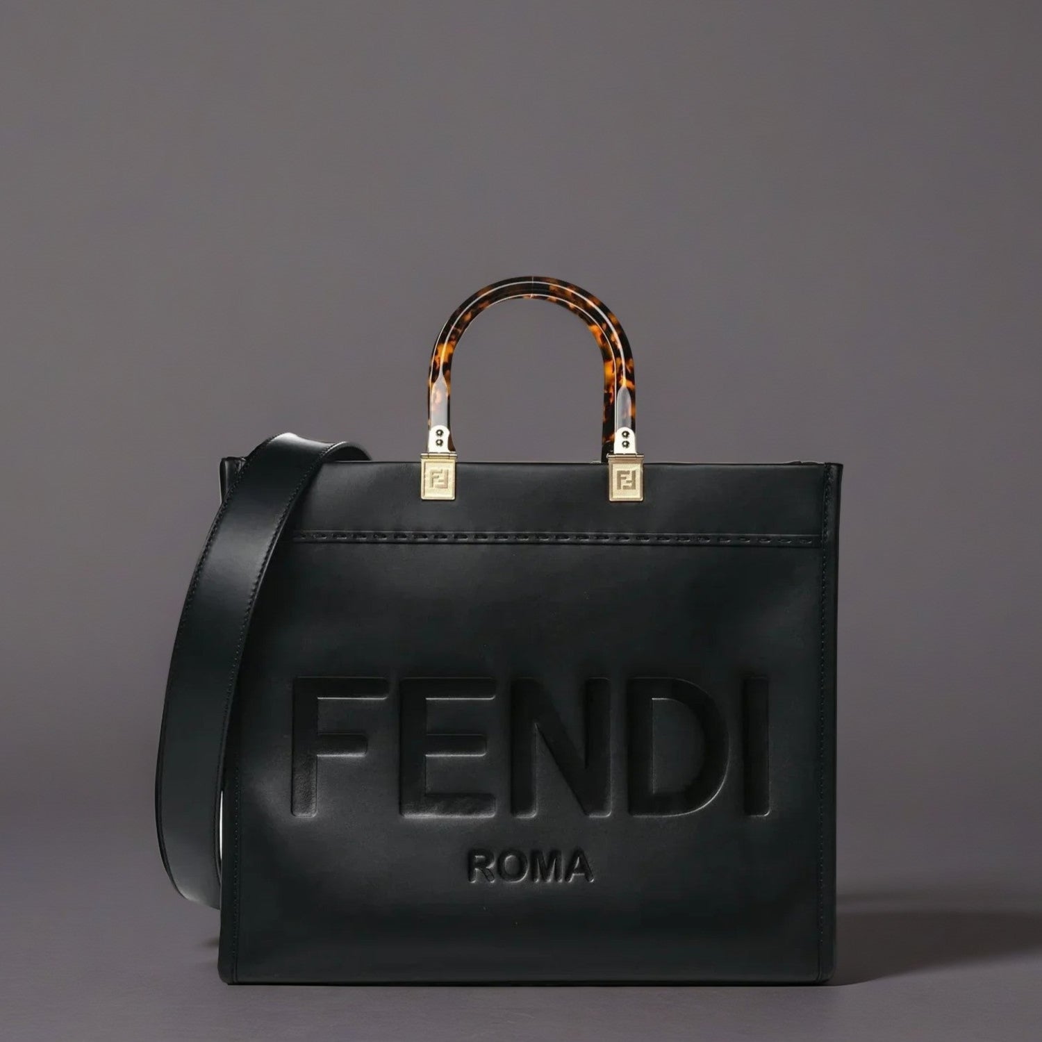 This is an authentic FENDI Calfskin Plexiglass Medium Sunshine Shopper Tote in Black. This stylish shopping tote is crafted in black leather with stitched detailing and features resin tortoiseshell top handles an optional shoulder strap, gold hardware and a bold, embossed Fendi logo. The top opens to a spacious interior with a leather base.