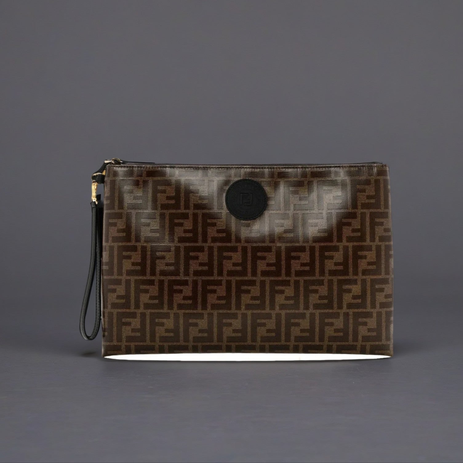 Glazed Fabric Vitello Century FF 1974 Stamp Patch Large Flat Pouch Mogano Panna Black