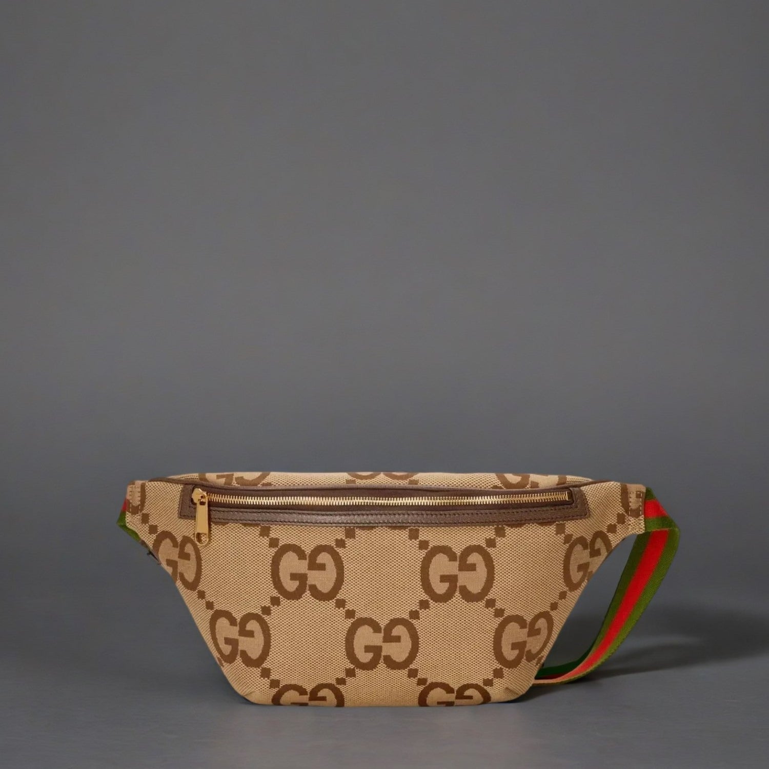 First seen as part of Gucci Aria, the jumbo version of the emblematic GG motif returns atop signature luggage pieces, imbuing each design with a pronounced logo feel. This belt bag is accentuated by the signature green and red House Web, a contemporary take on a Gucci archival belt buckle from the '70s.