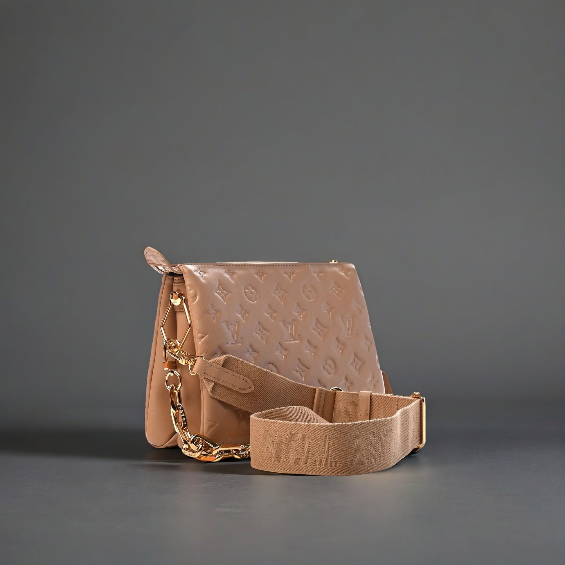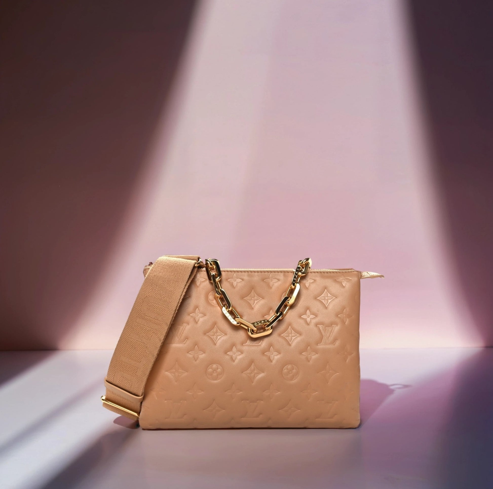 This is an authentic LOUIS VUITTON Lambskin Embossed Monogram Coussin PM in Camel. From Louis Vuitton's Spring 2021 collection, this soft and supple shoulder bag is crafted of monogram-embossed lambskin leather in beige. The bag can be carried solo as a clutch, with the gold hardware Edge Chain strap, or with the adjustable strap for wearing crossbody or on the shoulder. The three zippered compartments are lined in dark blue microfiber.