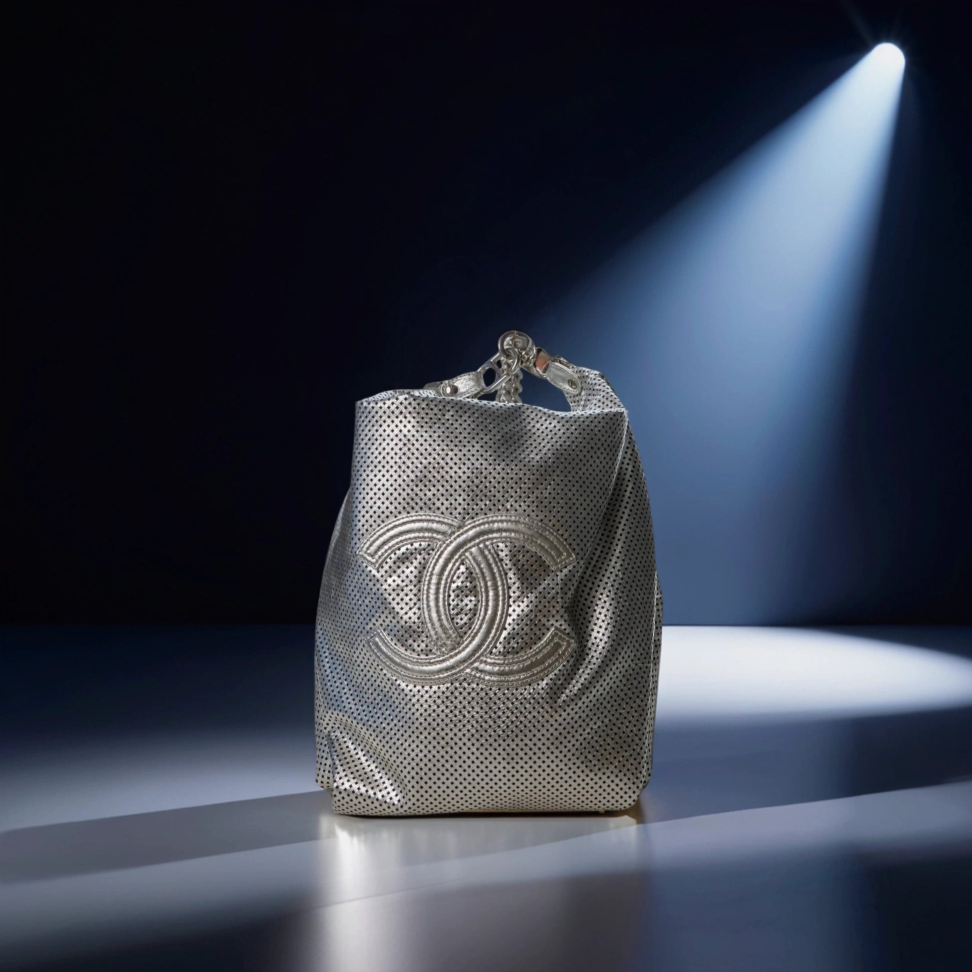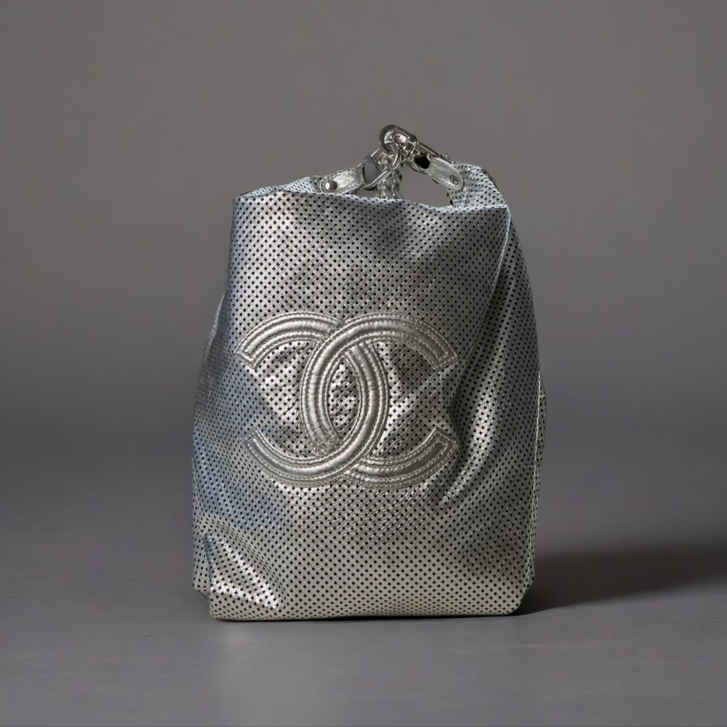 This is an authentic CHANEL Metallic Crackled Perforated Calfskin XL Rodeo Drive Tote in Silver. This tote is crafted of silver metallic calfskin leather that is uniformly perforated, sporting a large stitched Chanel CC logo. The bag can be carried by the silver chain handles or the optional silver leather shoulder strap. The top opens to a gray satin interior with a zipper pocket.