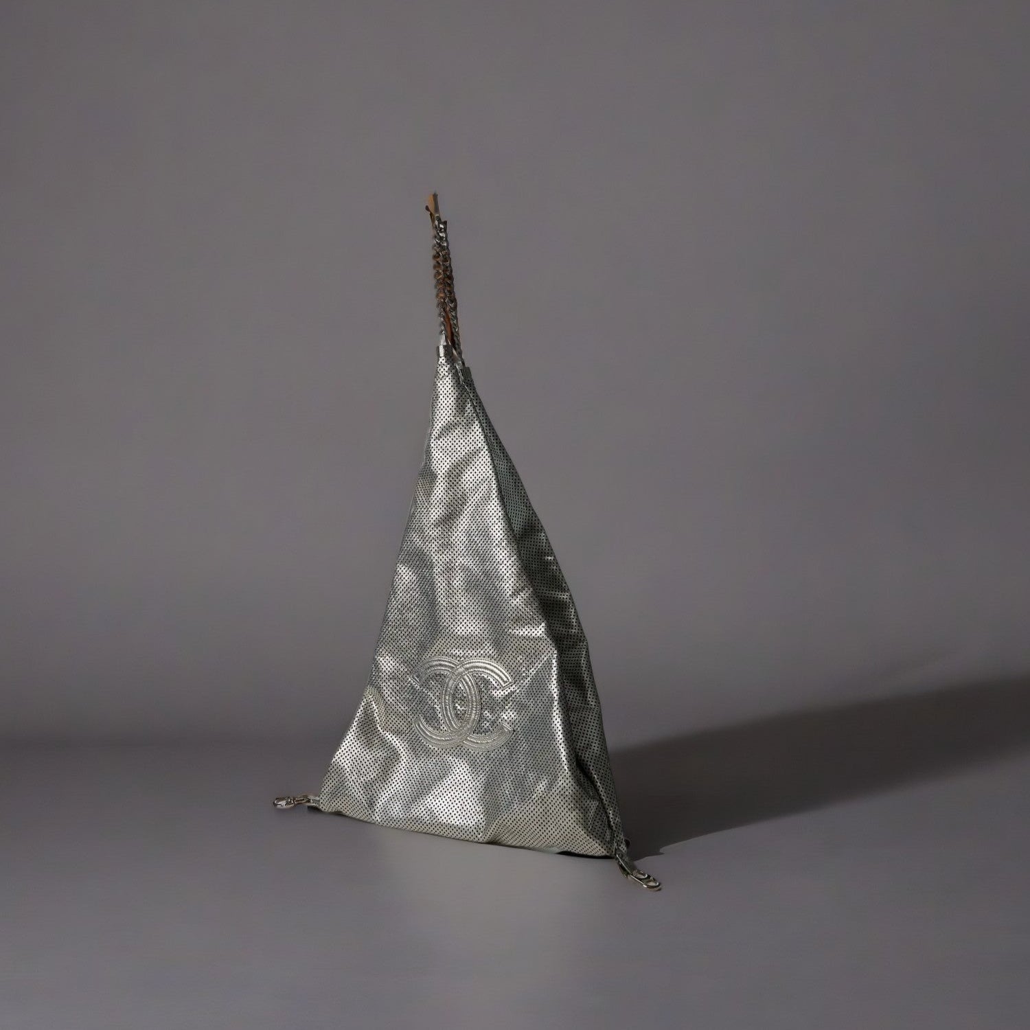 Metallic Glazed Calfskin Perforated XL Rodeo Drive Triangle Tote Silver