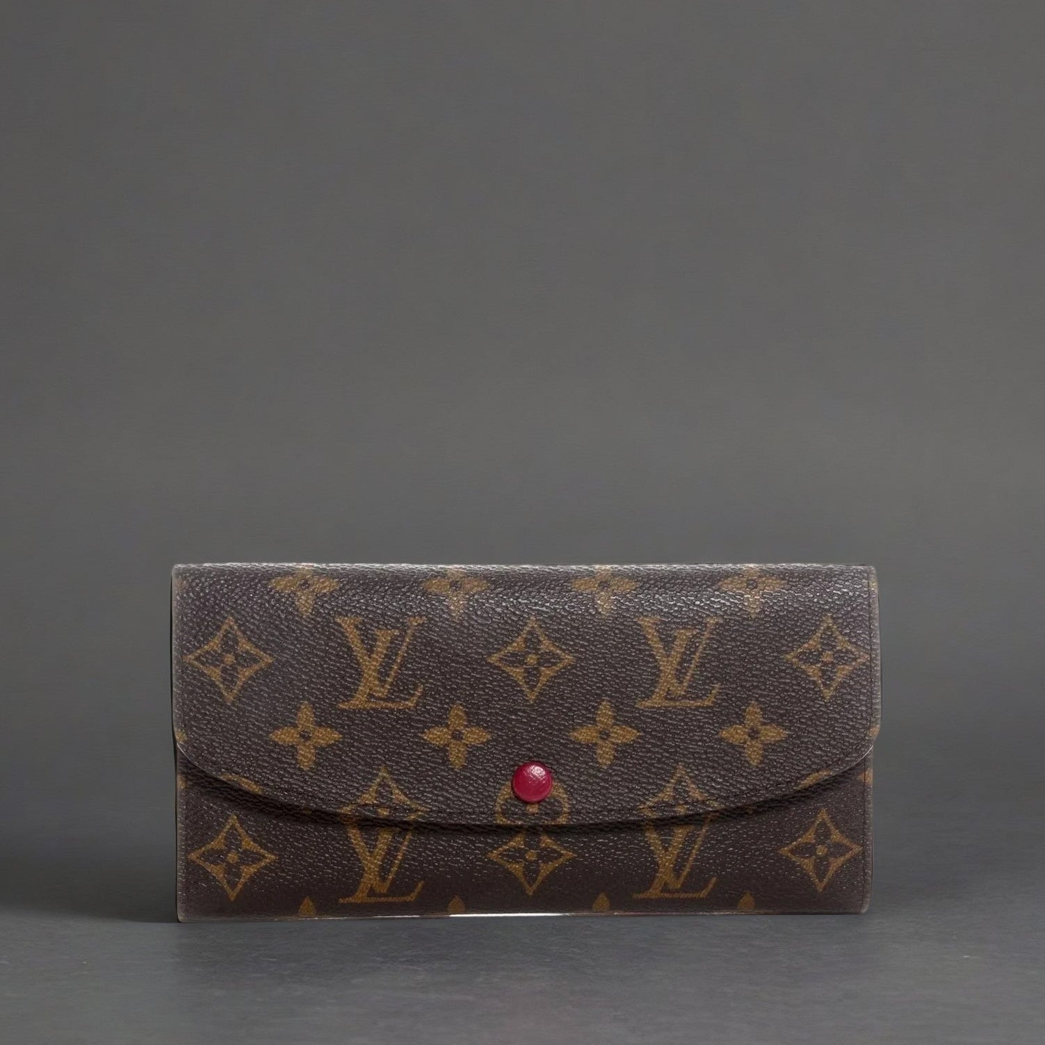 This is an authentic LOUIS VUITTON Monogram Emilie Wallet in Fuschia . This stylish wallet is crafted of Louis Vuitton brown monogram canvas. The front snap coordinates with the interior lining, which features two compartments and a zipper pocket with a card slot panel. This is a marvelous wallet that is practical with the luxury and style of Louis Vuitton.