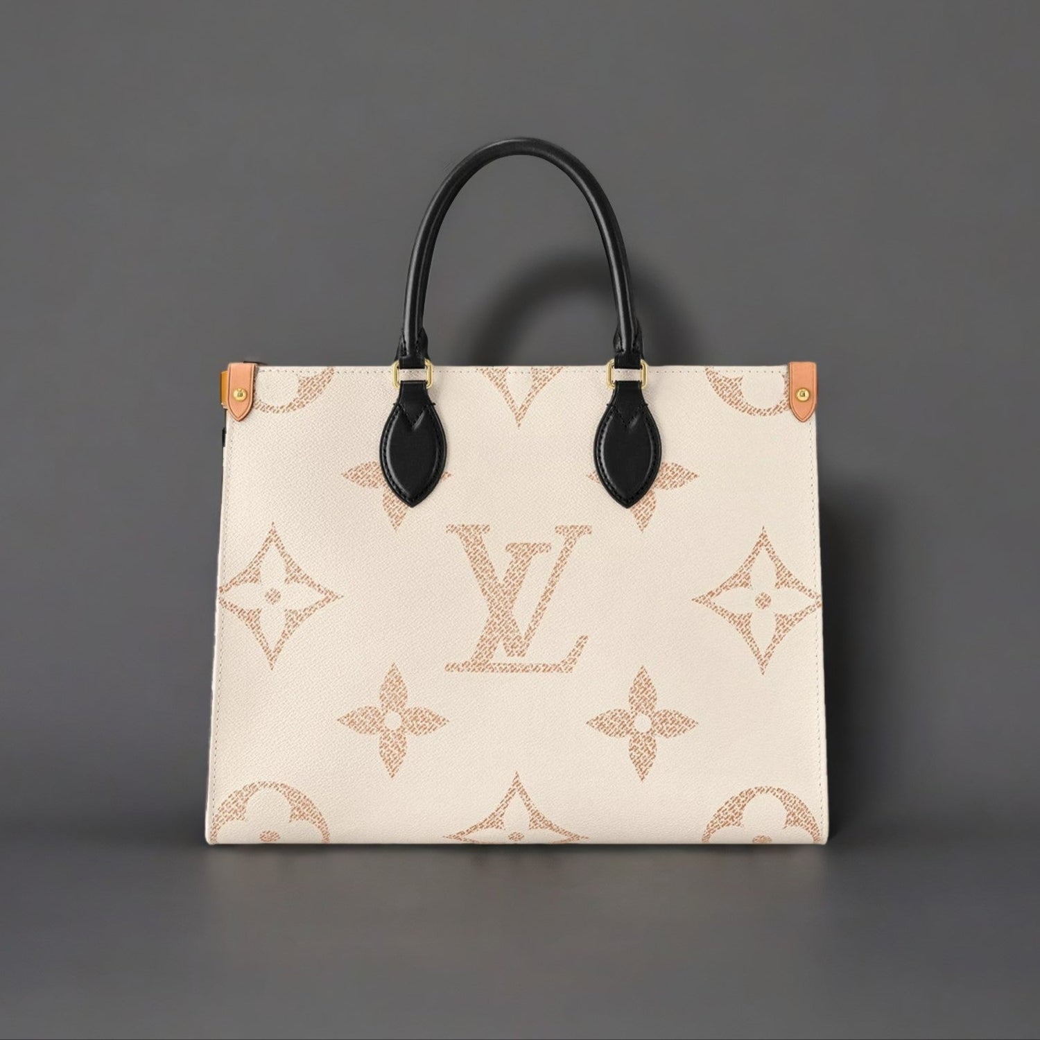 This authentic LOUIS VUITTON Monogram Giant Spring In The City OnTheGo MM is crafted of oversized monogram embossed coated canvas. It features rolled leather top handles, long strap handles, gold-tone hardware and opens to a spacious beige monogram fabric interior with a zipper and patch pockets.