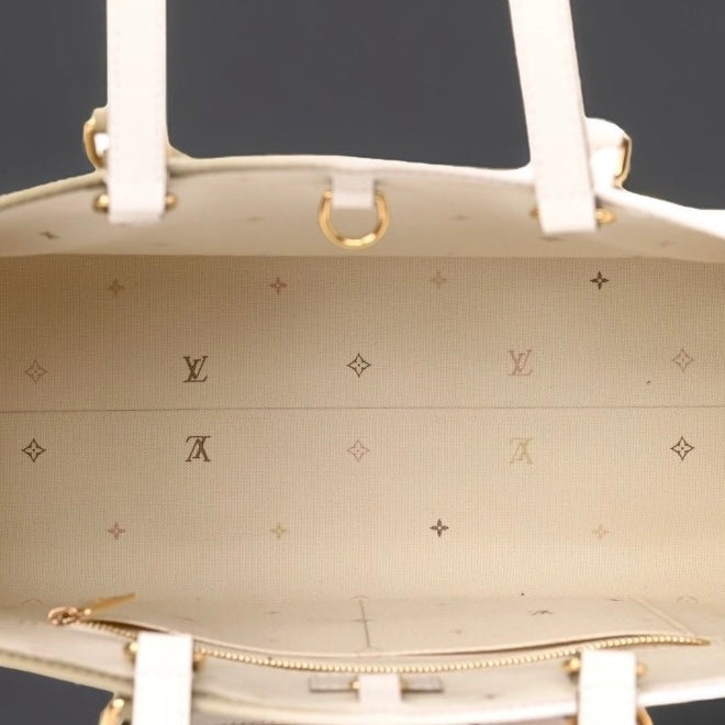 This is an authentic LOUIS VUITTON Monogram Giant Spring In The City OnTheGo MM in Sunset Kaki. This pre-owned luxury tote is part of the Louis Vuitton Spring 2022 “Spring in the City” collection. This limited edition tote is crafted of oversized Louis Vuitton monogram print embossed on ombre green coated canvas. The bag features rolled leather top handles, long strap handles, and gold-tone hardware. The top opens to a spacious white LV monogram fabric interior that has a zipper and two patch pockets. The top can be secured across with a snap strap inlay. The Louis Vuitton OnTheGo MM can be carried by hand, in the crook of the arm, or over the shoulder with the straps. This is the perfect everyday tote, only from Louis Vuitton!