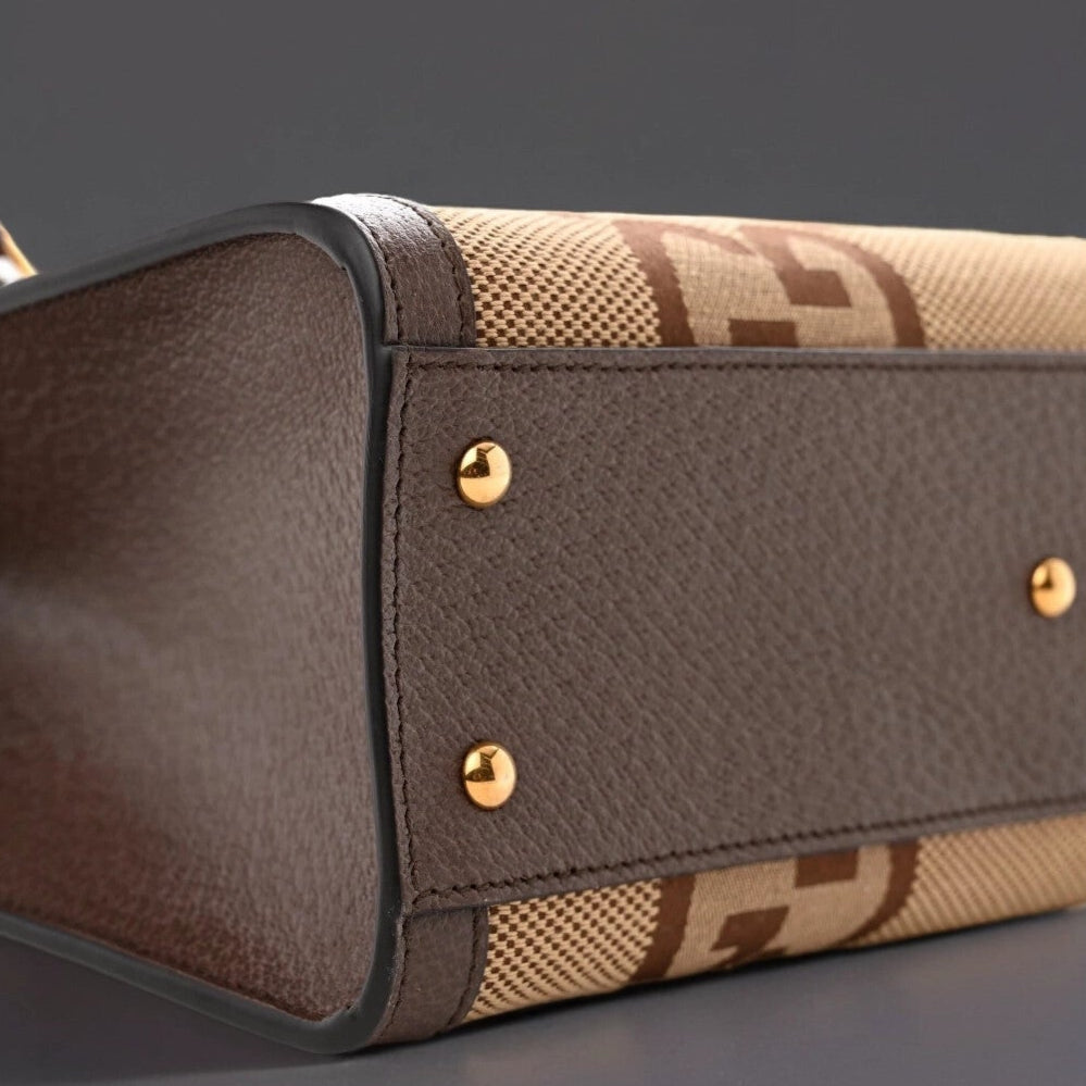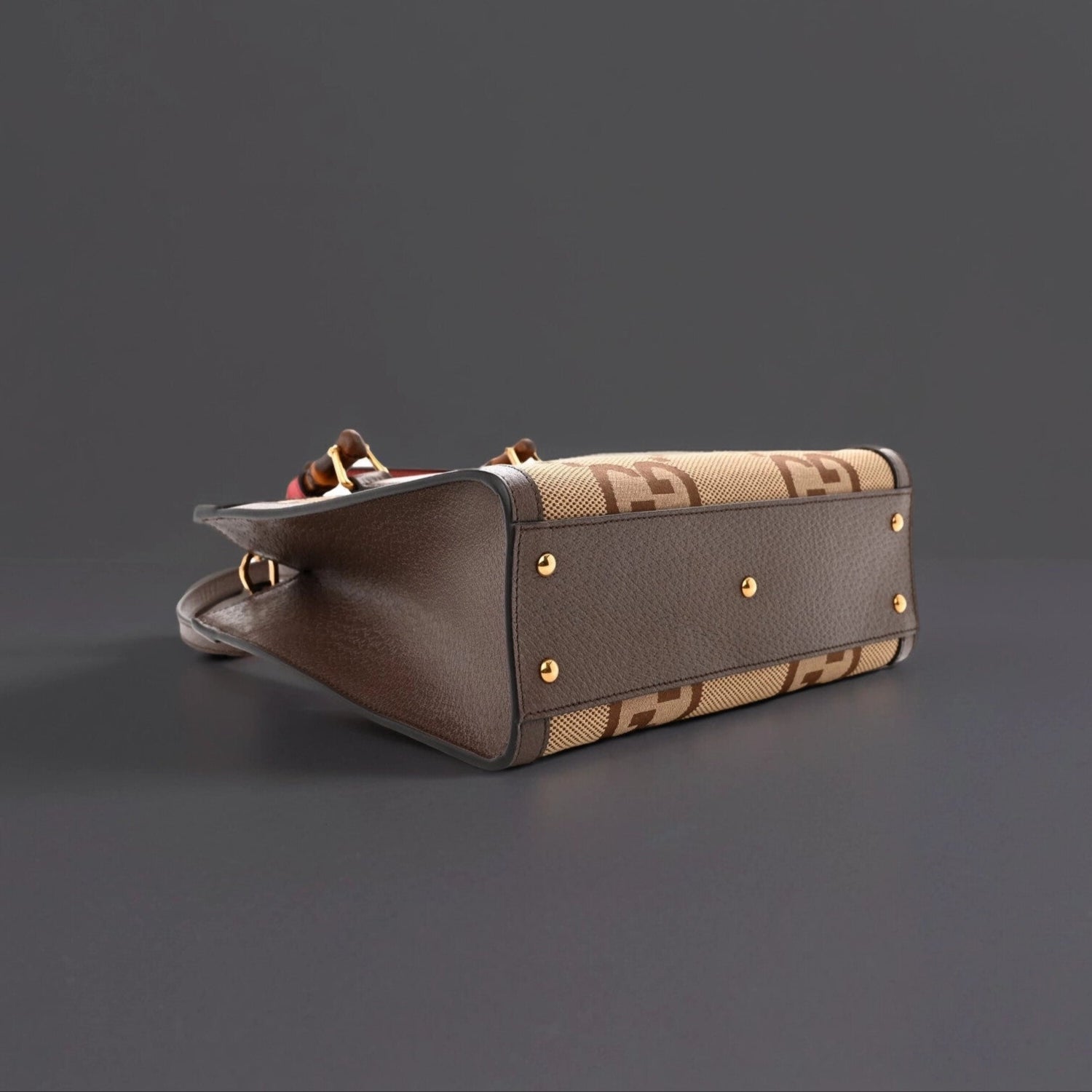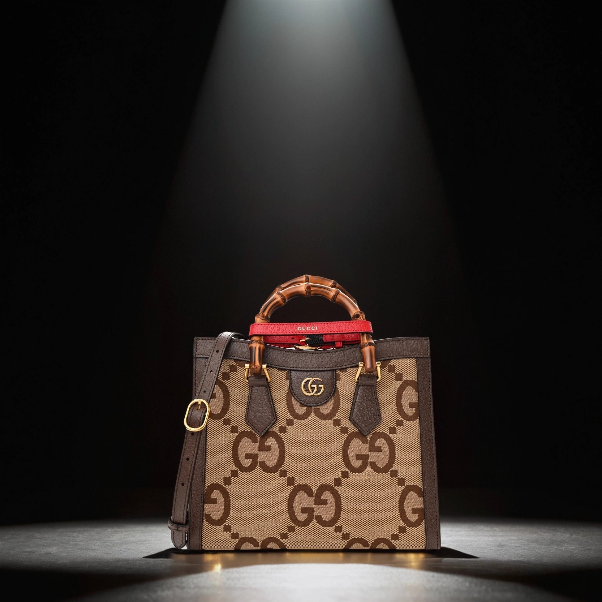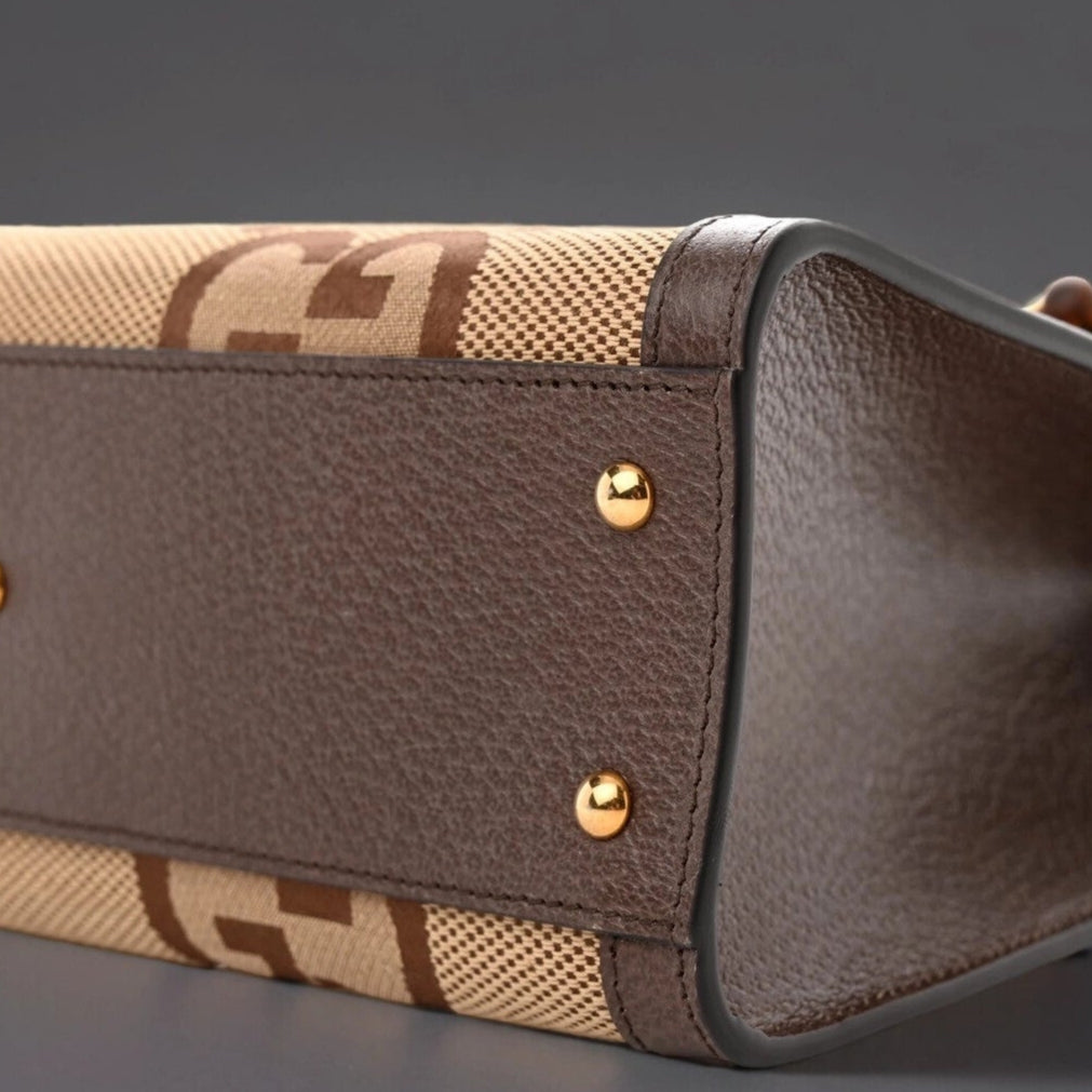 This is an authentic GUCCI Monogram Jumbo GG Textured Dollar Calfskin Small Diana Tote Bag in Camel, Ebony, New Acero, and Pomegranate Red. This bag is crafted of oversized monogram fabric in light brown. The bag has dark brown leather trim with sturdy bamboo top handles and features an interlocking gold GG logo. This handbag opens with a magnetic crossover flap to a beige leather interior with a patch pocket.