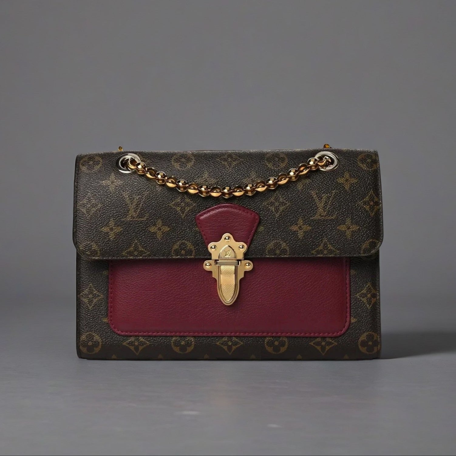 This is an authentic LOUIS VUITTON Monogram Victoire in Raisin. This chic shoulder bag is crafted of Louis Vuitton monogram on toile canvas and purple calfskin leather trim. The bag features a polished brass bijoux chain-link shoulder strap and a facing brass press lock for the flap. This opens the bag to a partitioned matching purple microfiber interior with a zipper compartment and a patch pocket.