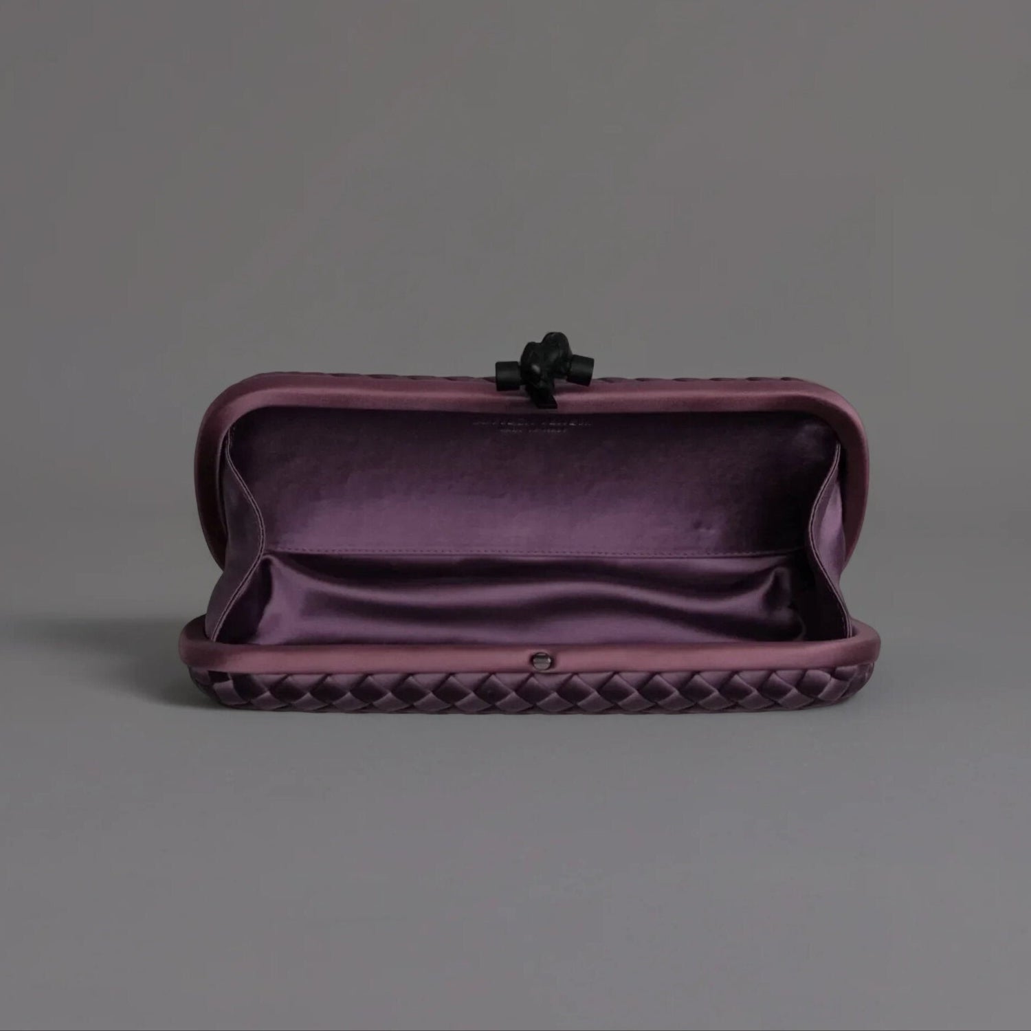 Add a touch of glamour to your evening wear with this Intrecciato Stretch Knot clutch from Bottega Veneta. Crafted from a pink-tone silk weave, this clutch features tonal ayers, intrecciato motif design and a brunito-finish metal knot shape closure. Pair this fabulous clutch for women with satin pumps. Clutch measures approximately.