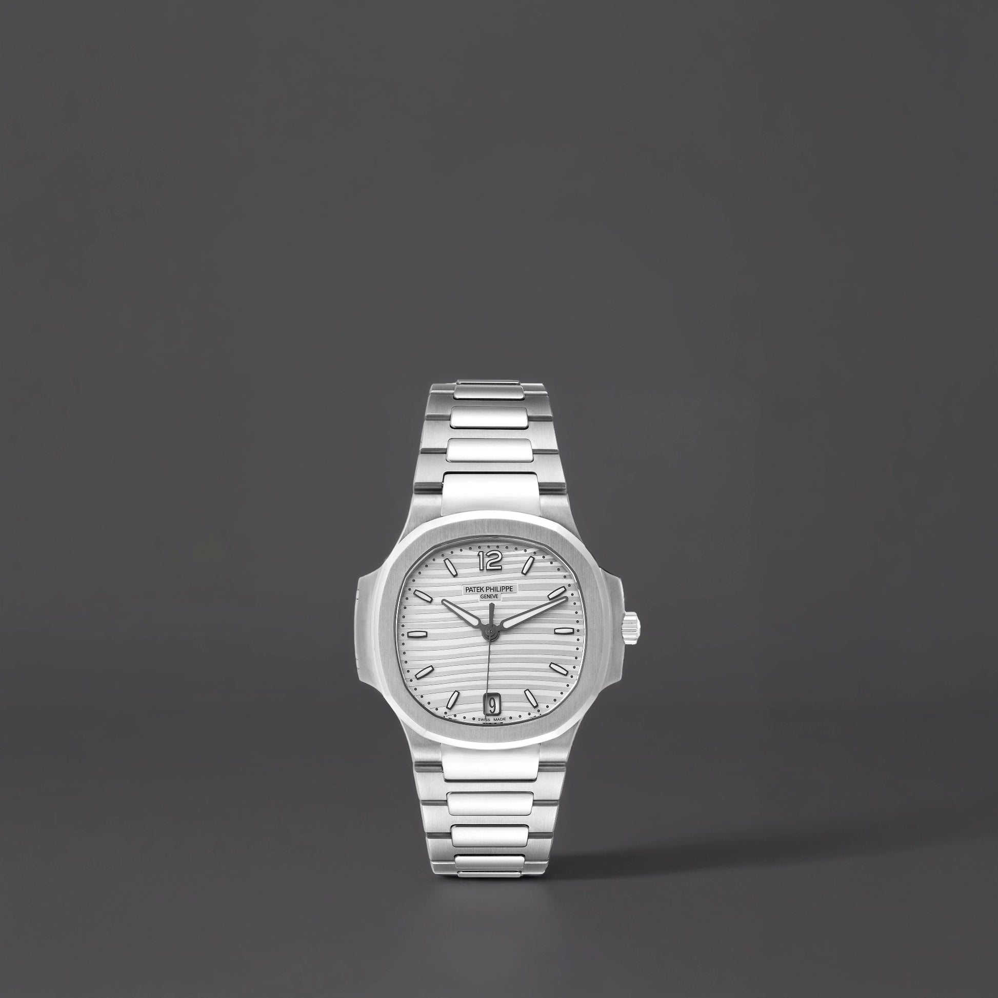 Patek Philippe Nautilus Midsize Steel Silver Dial Watch. Automatic self-winding movement. Stainless steel cushion shape case 35.2 mm x 35.2 mm. Exhibition transparent sapphire crystal caseback. Stainless steel bezel. Scratch resistant sapphire crystal. Silver opaline dial with raised luminous baton hour markers. Date window at 6 o'clock. Stainless steel bracelet with double deployant clasp
