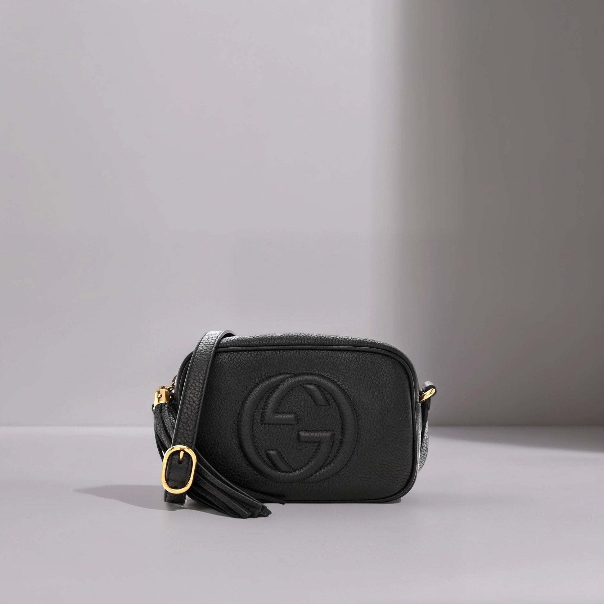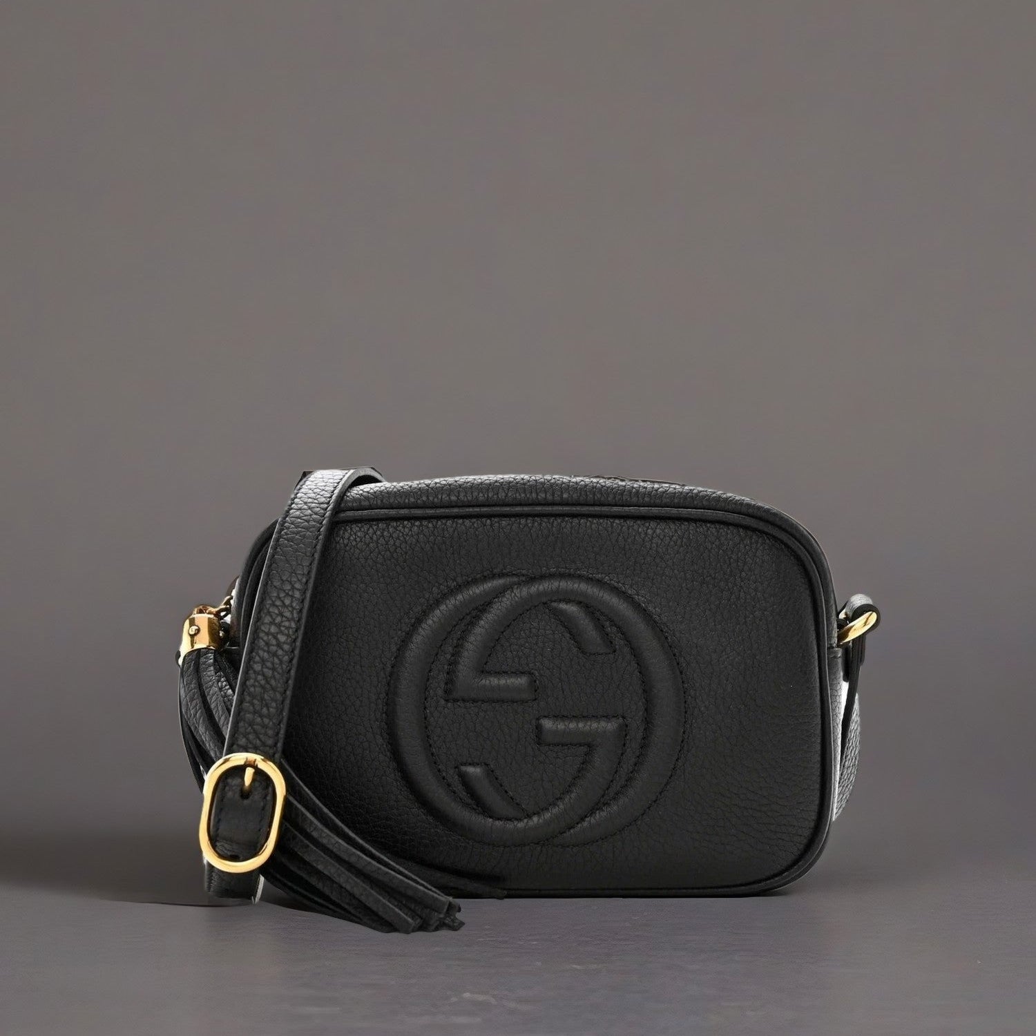 This is an authentic GUCCI Pebbled Calfskin Mini Soho Disco Bag in Black. This stylish crossbody bag is crafted of textured calfskin leather in black. The shoulder bag features an adjustable leather shoulder strap, a stitched interlocking GG logo, and a polished aged gold knobbed leather tassel zipper pull. The top zipper opens to a black nylon interior.