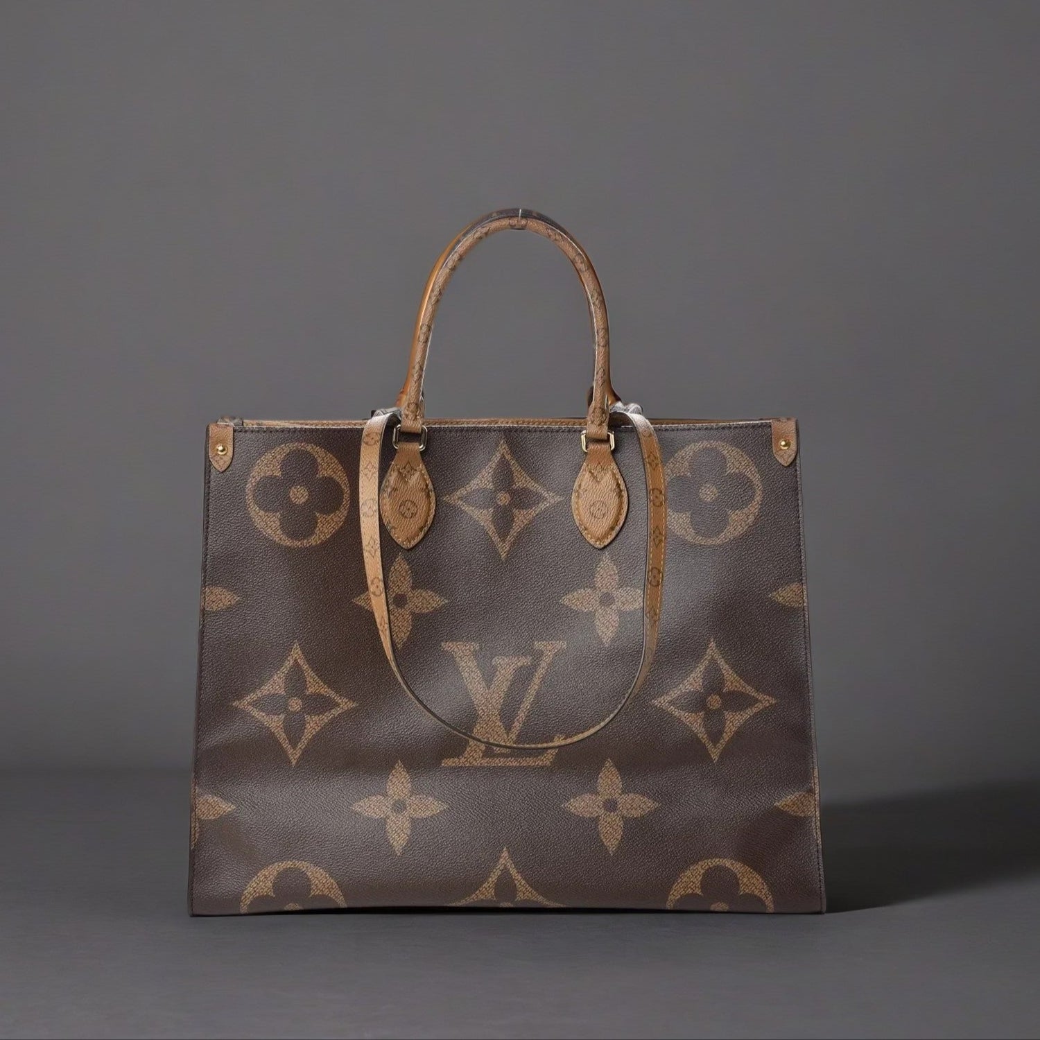 This is an authentic LOUIS VUITTON Reverse Monogram Giant Onthego GM. This limited edition tote features oversized and smaller sized versions of the classic Louis Vuitton monogram printed in brown on coated canvas in beige. The bag features top handles and longer strap handles. The top opens to a spacious red fabric interior with a zipper and patch pockets. This is a gorgeous tote with an exceptional look for a day of play, from Louis Vuitton.