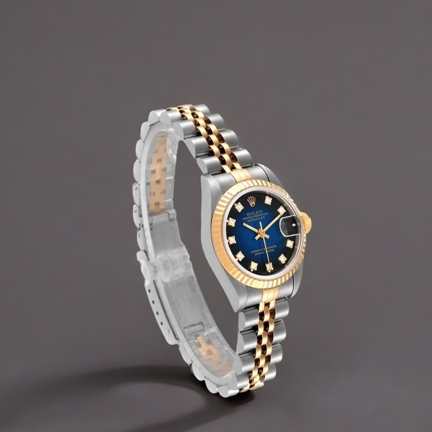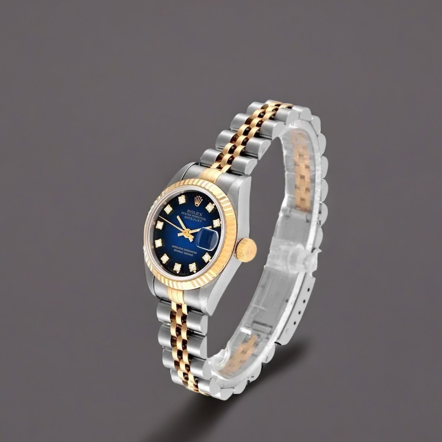 Rolex Datejust Steel Yellow Gold Blue Vignette Diamond Dial Ladies Watch. Stainless steel oyster case 26 mm in diameter. Rolex logo on a 18K yellow gold crown. 18k yellow gold fluted bezel. Scratch resistant sapphire crystal with cyclops magnifier. Blue Vignette dial with original Rolex factory diamond hour markers. Date calendar at 3 o'clock aperture. Stainless steel and 18k yellow gold jubilee bracelet with a fold over clasp.