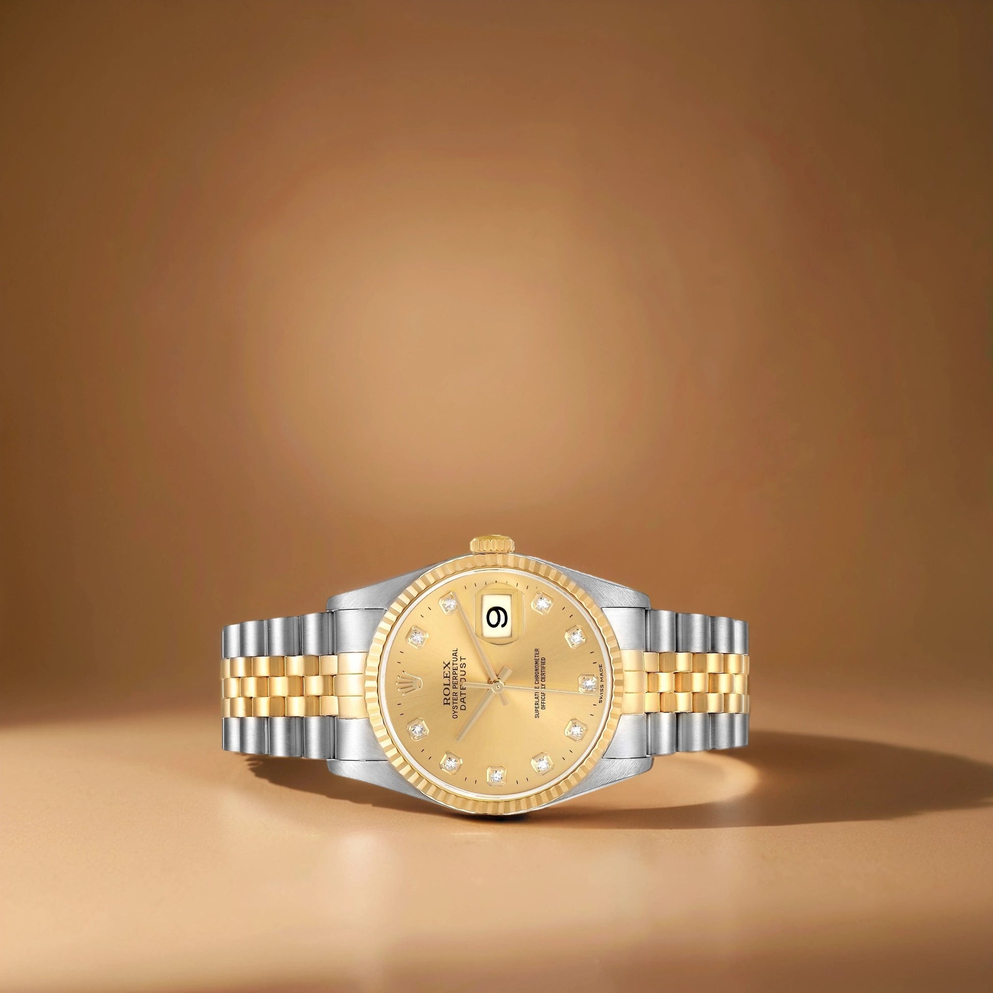 Rolex Datejust Midsize 36 Steel Yellow Gold Diamond Watch. Stainless steel oyster case 36 mm in diameter. Rolex logo on an 18K yellow gold crown. 18k yellow gold fluted bezel. Scratch resistant sapphire crystal with cyclops magnifier. Champagne jubilee anniversary dial with original Rolex factory diamond hour markers. Date calendar at 3 o'clock aperture. Stainless steel and 18k yellow gold jubilee bracelet with fold over clasp.