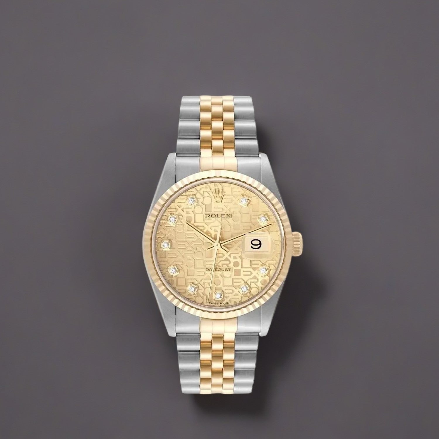 Rolex Datejust Stainless Steel Yellow Gold Watch . Stainless steel case 36.0 mm in diameter. Rolex logo on an 18K yellow gold crown. 18k yellow gold fluted bezel. Scratch resistant sapphire crystal with cyclops magnifier. Champagne anniversary jubilee dial with original Rolex factory diamond hour markers and yellow gold hands. Date window at 3 o'clock aperture. Stainless steel and 18k yellow gold jubilee bracelet with fold over clasp.