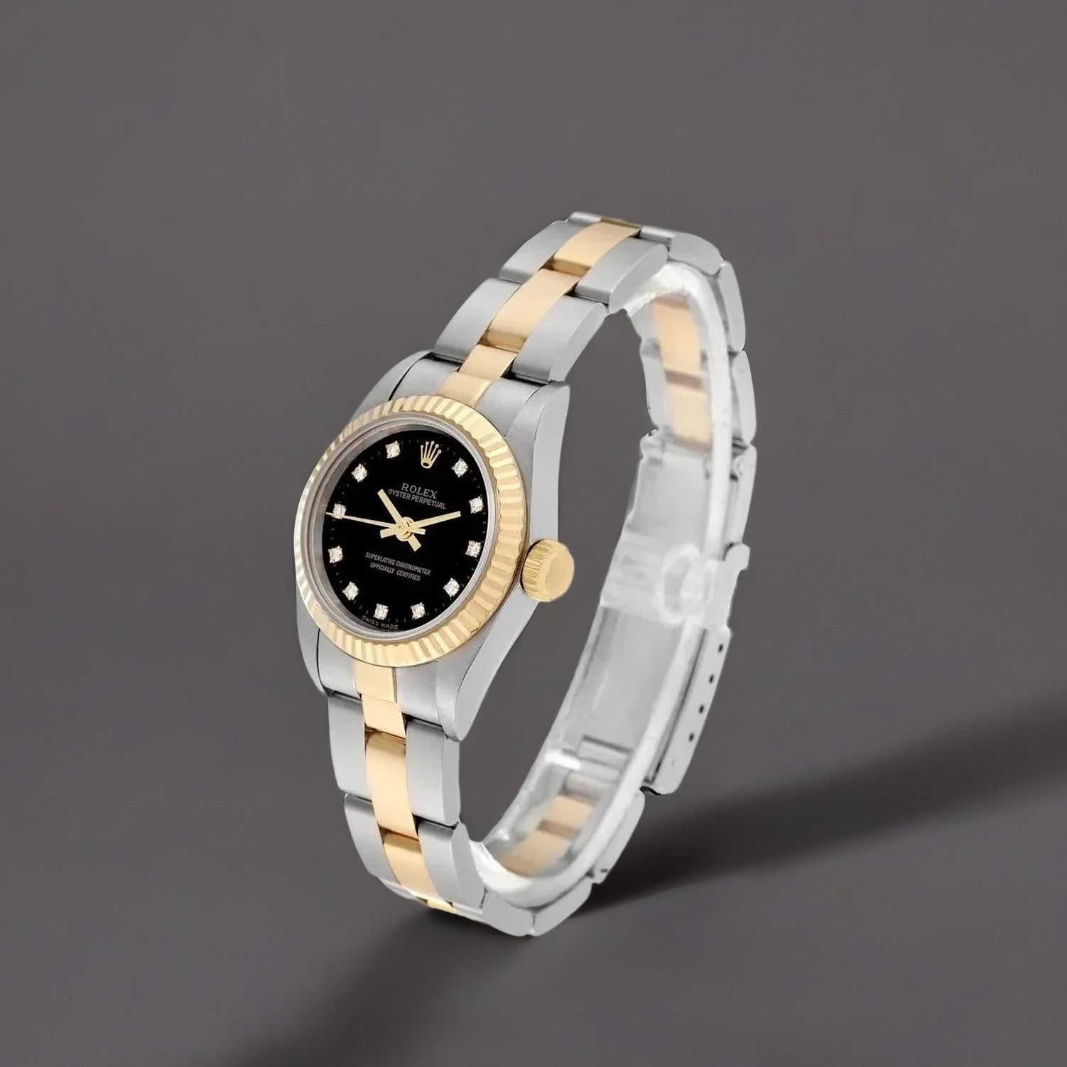 Rolex Oyster Perpetual Steel Yellow Gold Black Diamond Dial Watch