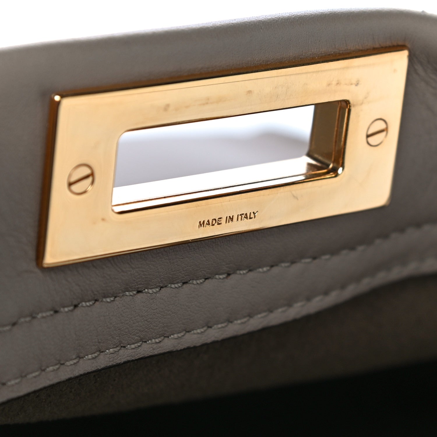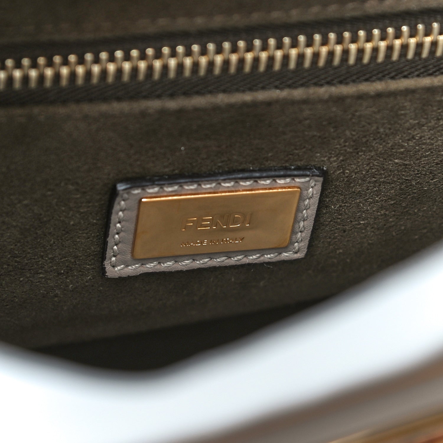 We guarantee this is an authentic FENDI Silk Calfskin Plexi Tortoise Medium Peekaboo Iconic Satchel Dove or 100% of your money back. This chic tote is finely crafted of taupe calfskin leather. This medium-sized bag features gold and tortoise squared turn locks on either side that when released, relax the outer layer to reveal the inner panel of a brown microfiber interior with a zipper pocket. The handbag can be carried as a shoulder bag with the optional adjustable strap or as a tote by the inner handle.