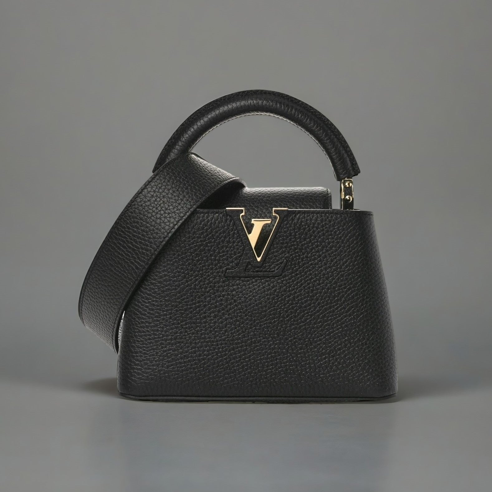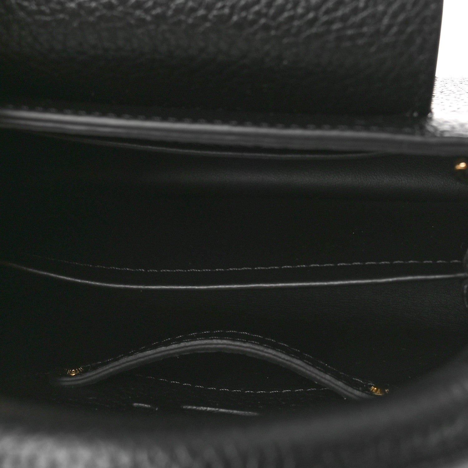 This is an authentic LOUIS VUITTON Taurillon Capucines Mini in Black. This beautiful shoulder bag is composed of luxurious textured calfskin leather in black. The handbag features a single rolled leather reinforced top handle with stylized links, an optional shoulder strap, and a crossover flap that inserts behind the prominent black and gold LV. This opens to a partitioned black leather interior with a zipper pocket and handy d-ring clasp.