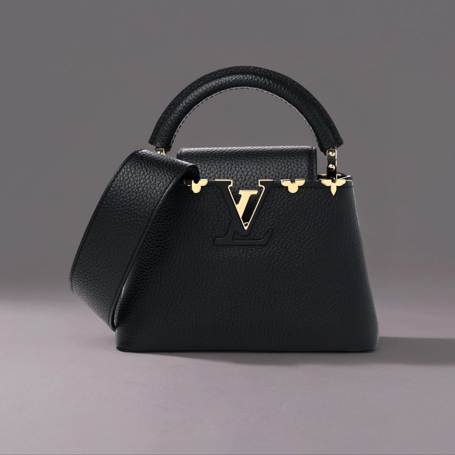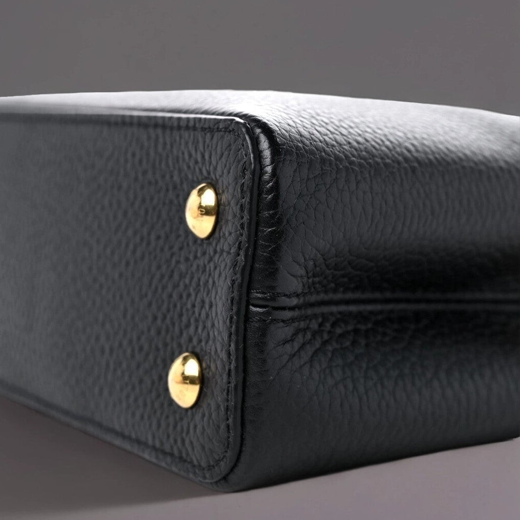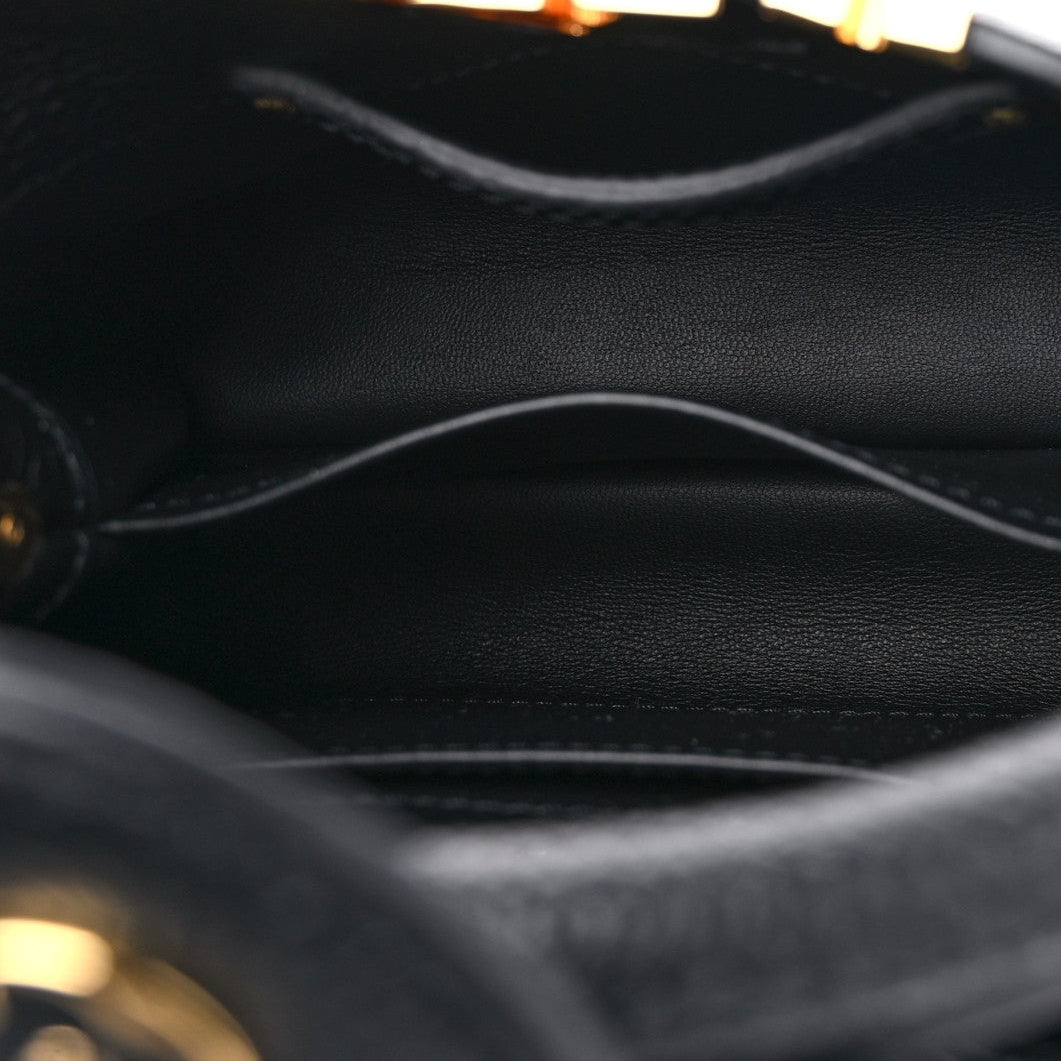 This is an authentic LOUIS VUITTON Taurillon Embellished Flower Crown Capucines Mini in Black. This beautiful shoulder bag is crafted of luxurious textured calfskin leather in black with gold-toned flower monogram detailing along the top edge. The handbag features a single reinforced rolled leather top handle with stylized links and a matching black leather removable shoulder strap. The crossover flap inserts behind the prominent black and gold LV on the front and opens to a partitioned black leather interior with a patch pocket.