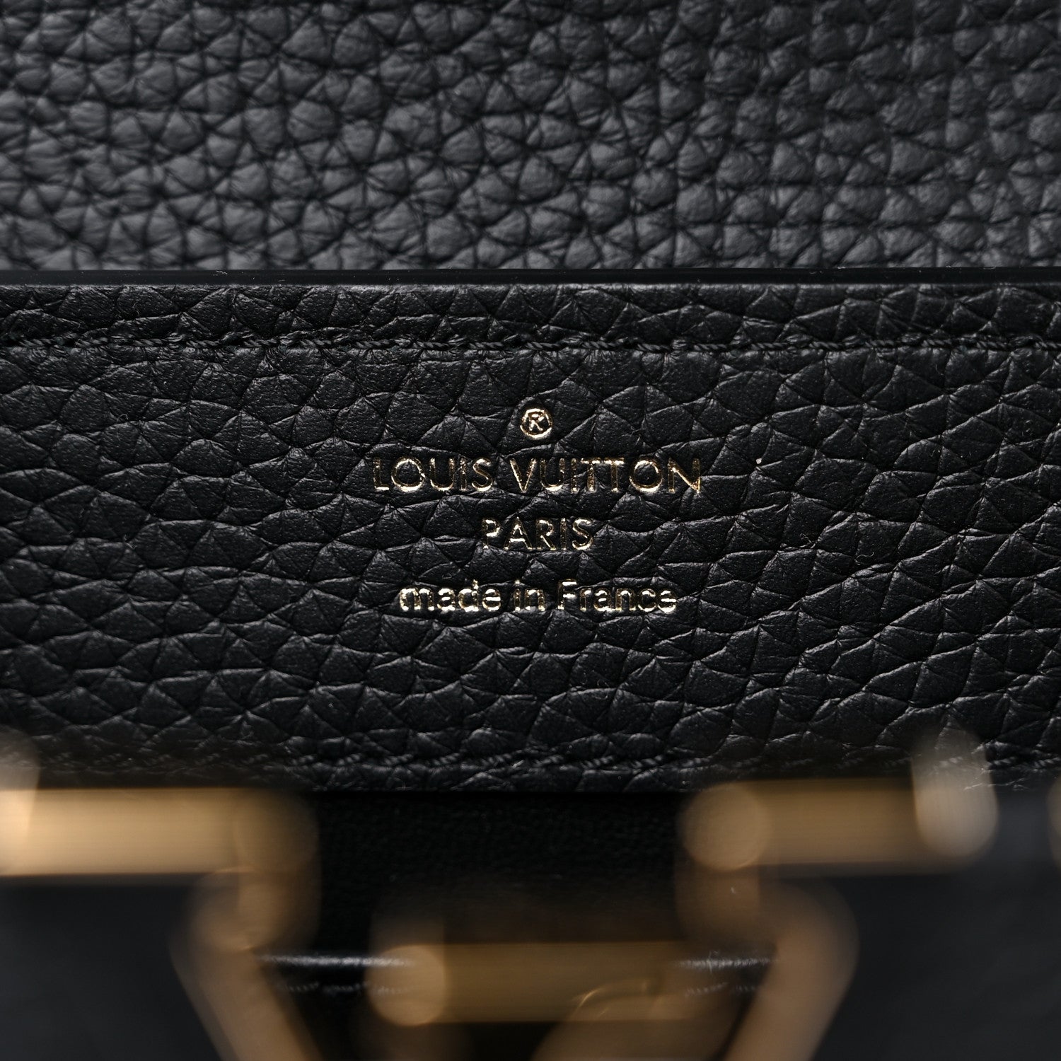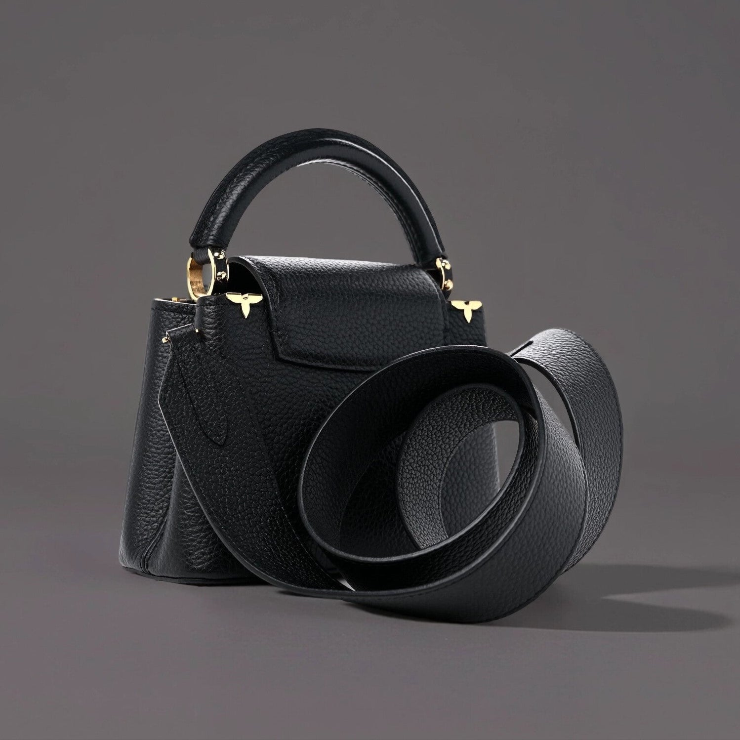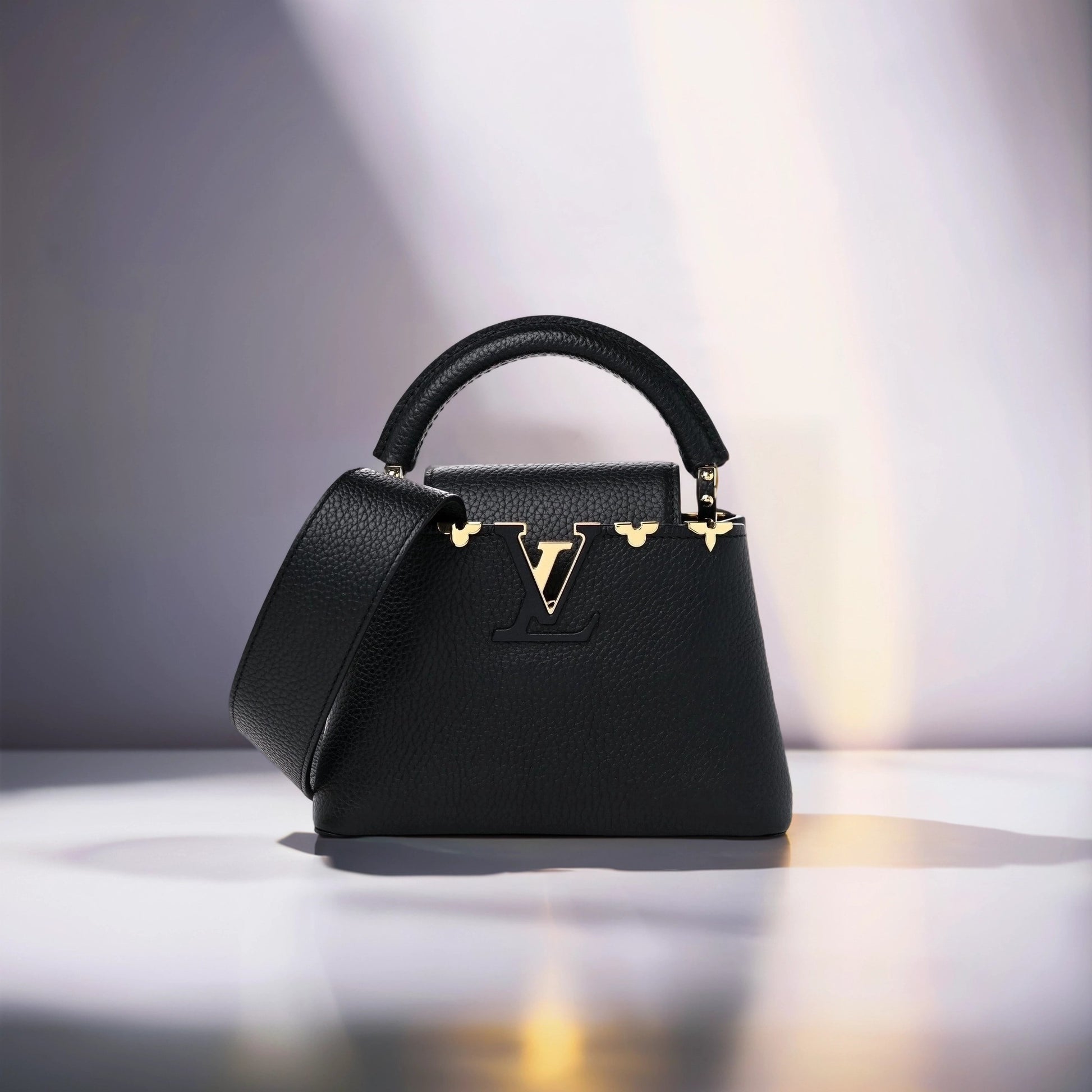 This is an authentic LOUIS VUITTON Taurillon Embellished Flower Crown Capucines Mini in Black. This beautiful shoulder bag is crafted of luxurious textured calfskin leather in black with gold-toned flower monogram detailing along the top edge. The handbag features a single reinforced rolled leather top handle with stylized links and a matching black leather removable shoulder strap. The crossover flap inserts behind the prominent black and gold LV on the front and opens to a partitioned black leather interior with a patch pocket.
